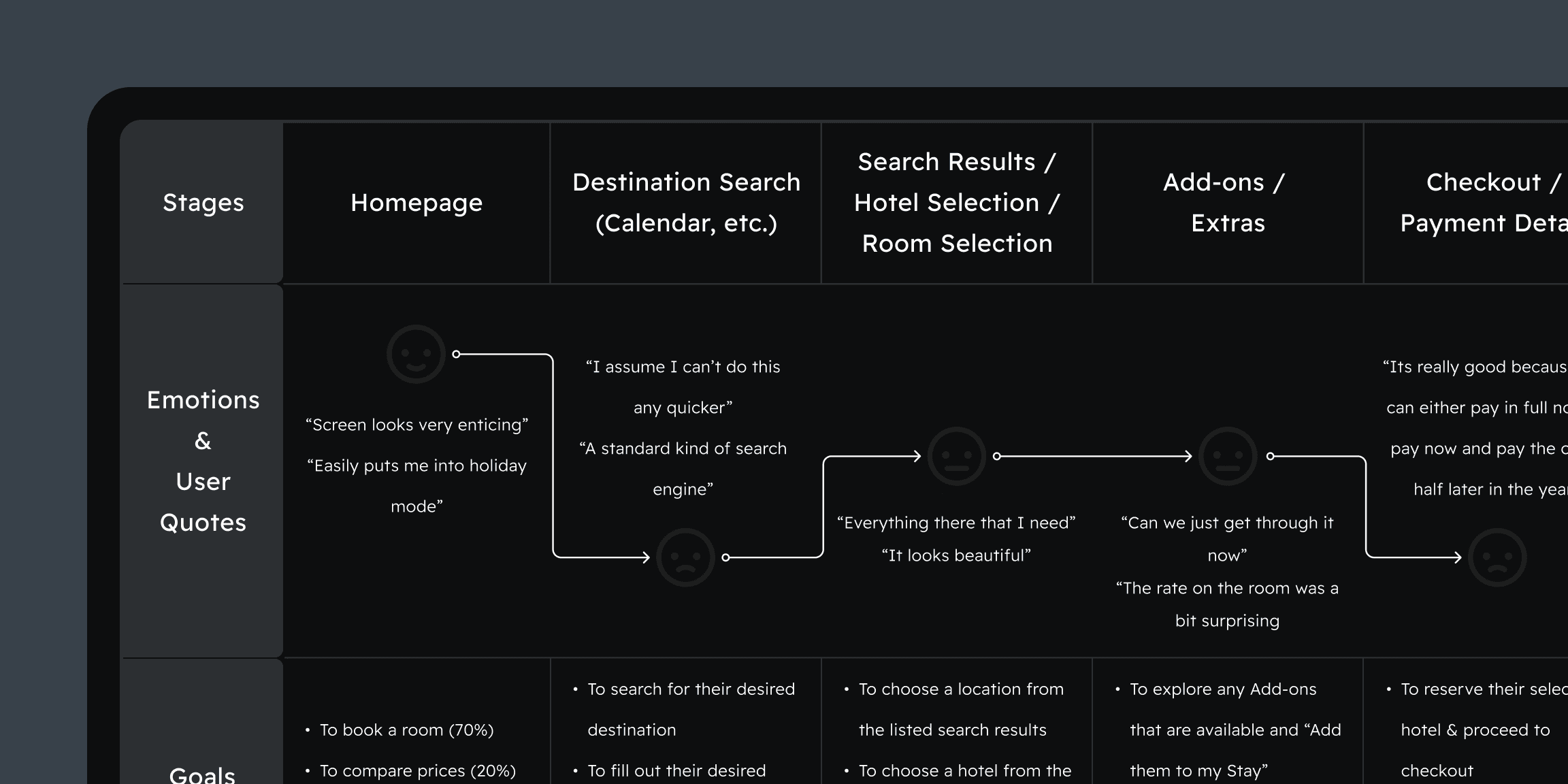 To further understand the user experience, I created a customer journey map using insights gathered from the affinity diagram. This allowed me to visualise the user’s journey while capturing their goals, behaviours, emotions, and pain points at each stage of the booking process.