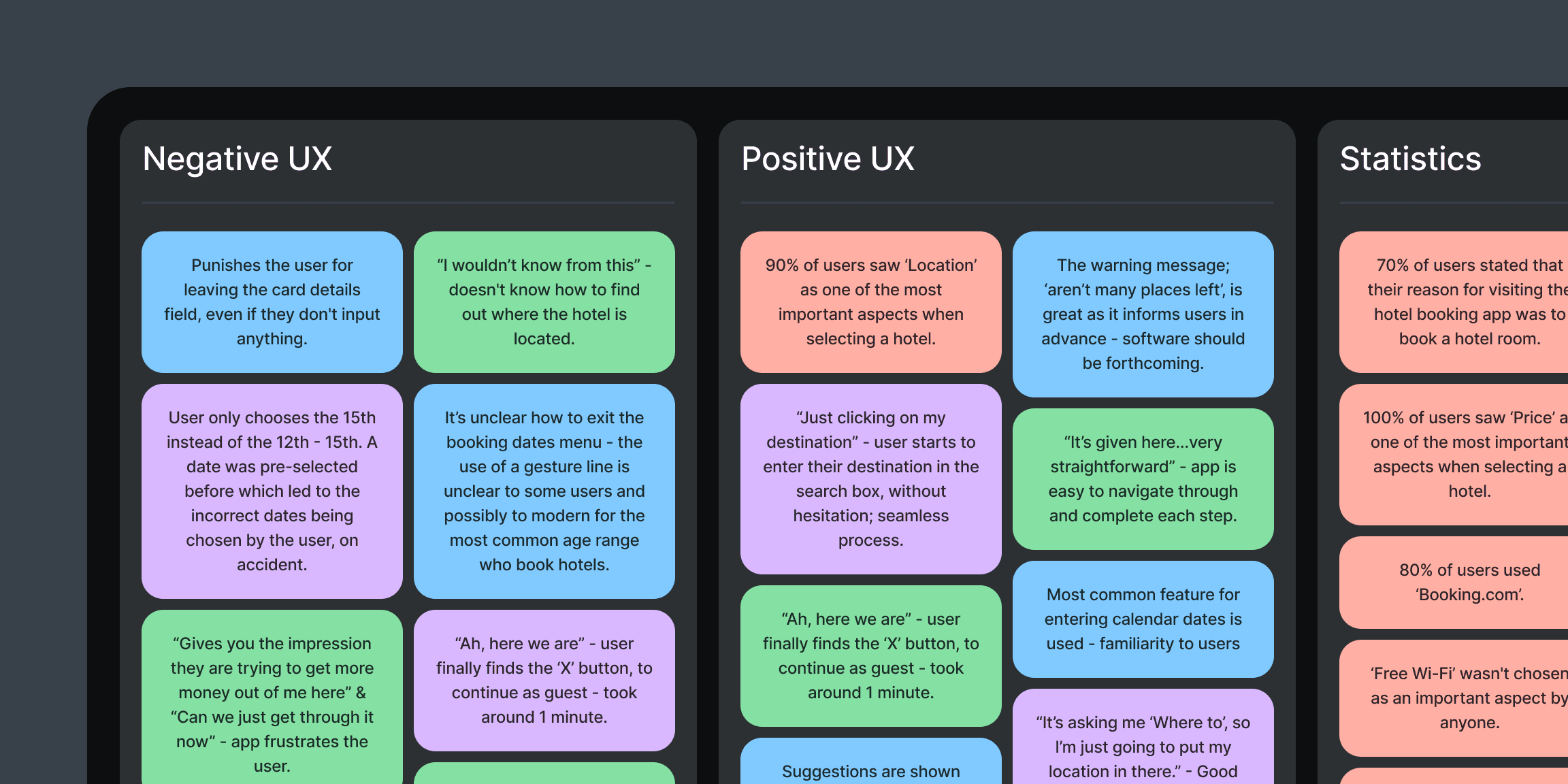 The analysis highlighted how visuals such as hotel images help build trust and confidence when choosing where to stay. It also reinforced the importance of simplicity, as cluttered interfaces distracted users from their main goal. Clear, well-placed calls to action and structured information were also key to helping users move through the booking process with ease.
