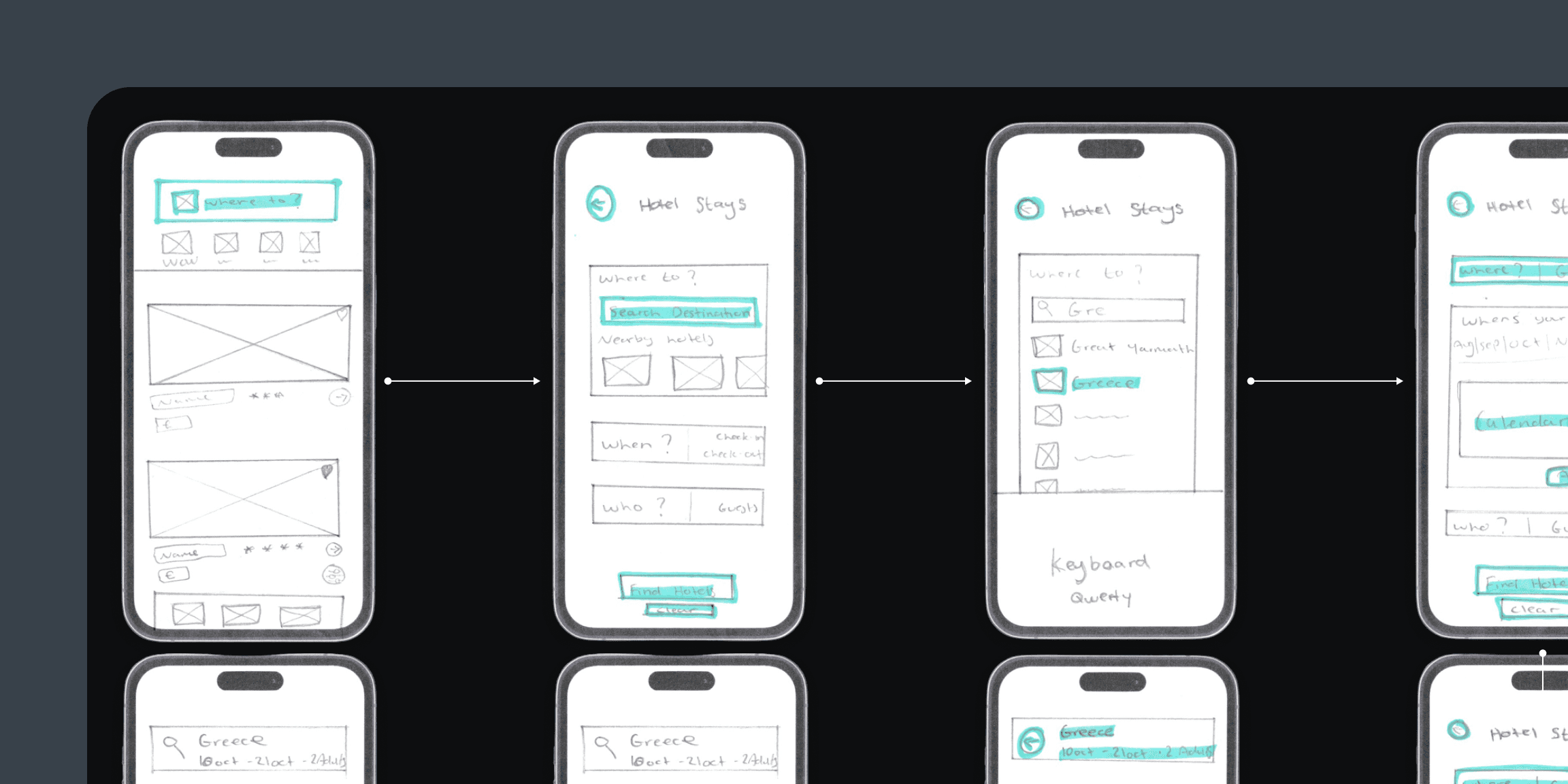 Using the flow diagram as a guide, I created a series of interaction design sketches to explore how each stage of the booking journey could work on screen. These low-fidelity wireframes helped establish the structure and layout of key pages before moving into higher-fidelity design.